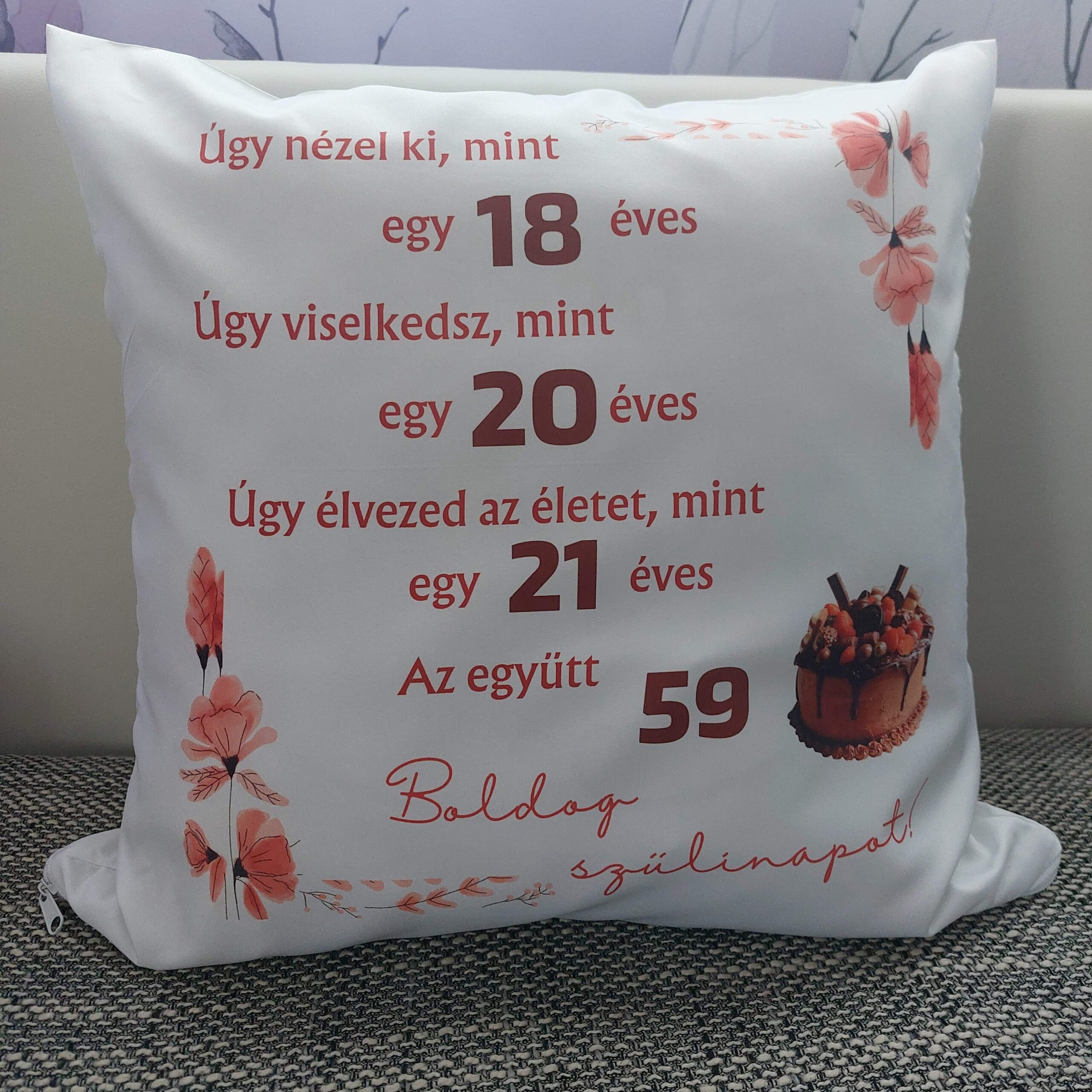 Ez az egyedi születésnapi díszpárna humoros és kedves módon ünnepli az életkort. A design lényege, hogy az életkor több „fiatalos” számra bontva jelenik meg, majd ezek összege adja ki az aktuális kort – így játékos és vidám ajándék minden ünnepelt számára.